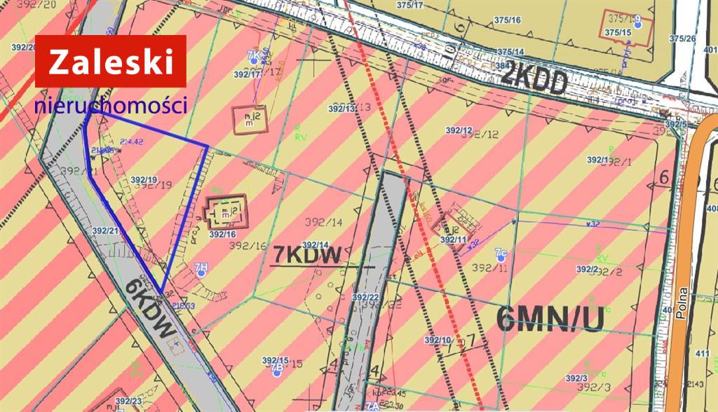 Działka ze spadkiem, nachylona do drogi, o kształcie nieregularnym, dojazd drogą gminną. W ewidencji gruntów – PsIV, RV. Aktualny plan zagospodarowania przestrzennego terenu symbol 6.MN/U tj. tereny zabudowy mieszkaniowej jednorodzinnej i zabudowy usługowej.